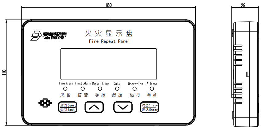 確認(rèn)燈 | 火警(紅色)、首警(紅色)、手報(bào)(紅色)、數(shù)據(jù)(紅色)、運(yùn)行(綠色)、消音(紅色) |